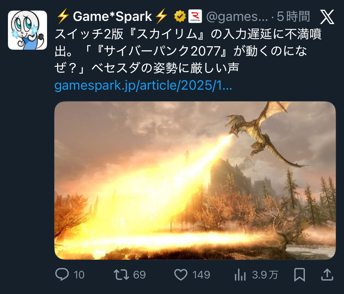 | … | 56無念Nameとしあき25/12/12(金)06:38:31 ID:npofZJQoNo.1372441908+switch2アプグレスカイリム容量クソデカだし遅延酷いから今は買わなくていいな |