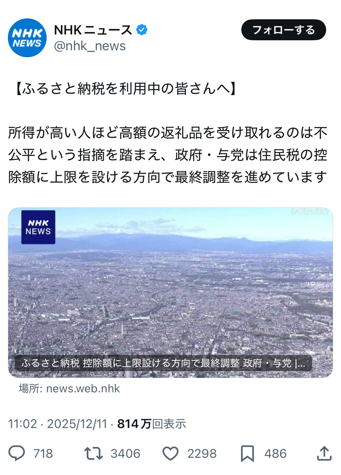 | … | 18無念Nameとしあき25/12/12(金)16:38:01No.1372524703+>所得が高い人ほど高額の返礼品を受け取れるのは不公平という指摘を踏まえ、政府・与党は住民税の控除額に上限を設ける方向で最終調整を進めています |
