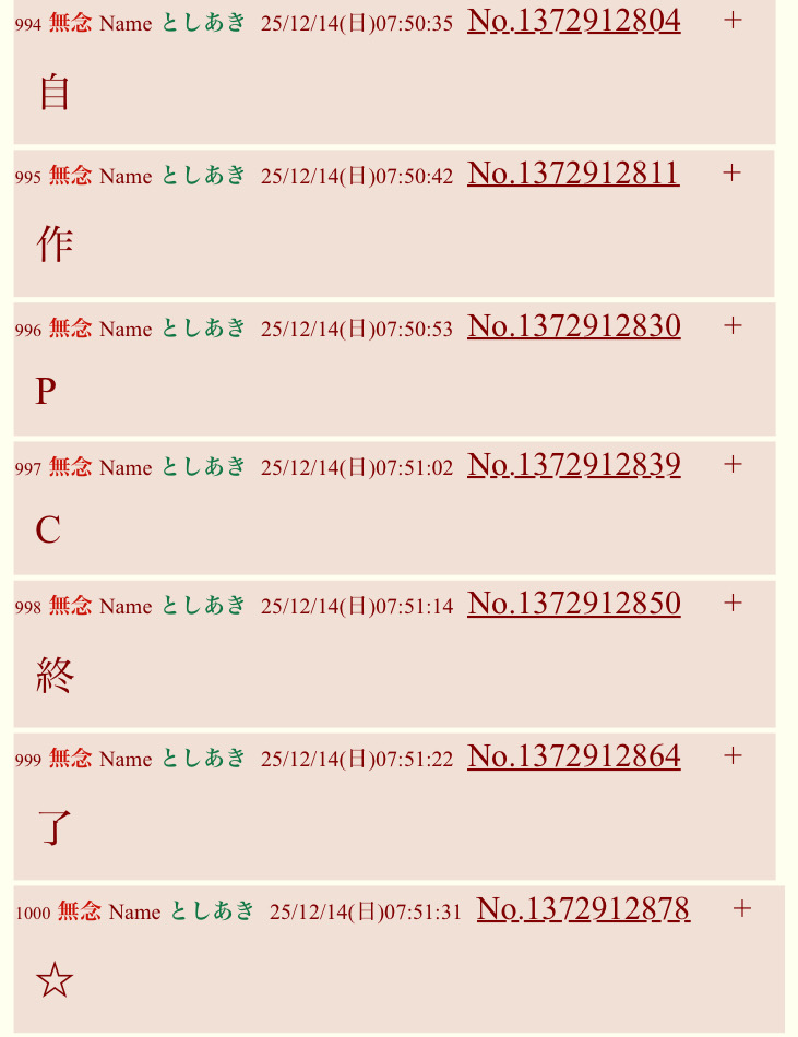 | … | 21無念Nameとしあき25/12/14(日)05:10:47No.1372905083+つまんねーリクにこたえても面白くないぶい |