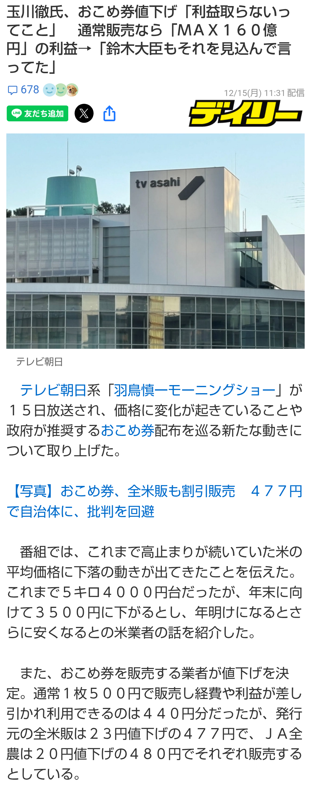 | … | 211無念Nameとしあき25/12/17(水)15:36:36No.1373685336+こいつがお米券にこだわっていないとか言ってたけど |
