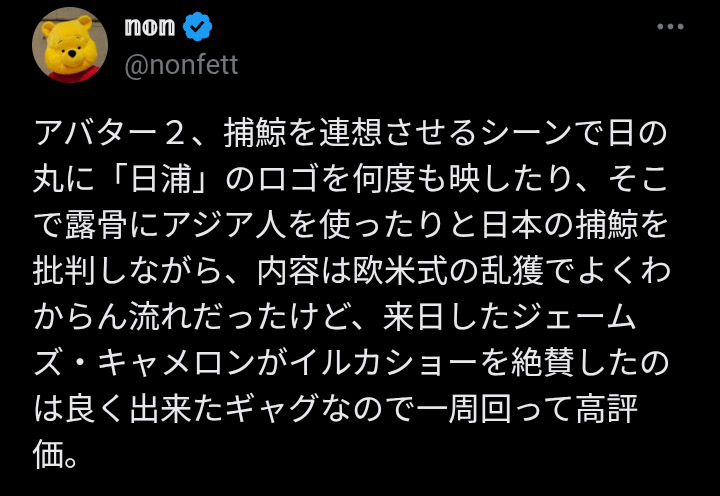 | … | 51無念Nameとしあき25/12/19(金)16:17:21No.1374122305+>キャメロンはこの前来日したばっかだしむしろ親日なんだけどお魚さんのことになると顔真っ赤になっちゃうだけなんだよ |
