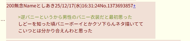 | … | 42無念Nameとしあき25/12/19(金)13:14:02No.1374095478+>しどーのバニーボーイってだいぶ昔だがその頃からの粘着か |