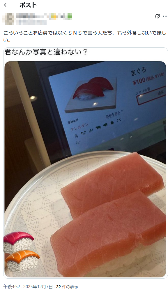 | … | 39無念Nameとしあき25/12/19(金)16:19:23No.1374122631そうだねx1100円寿司に文句言われてもな |