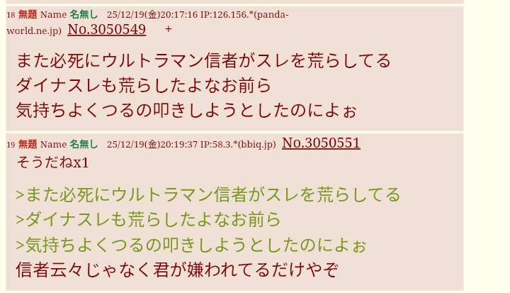 | … | 64無念Nameとしあき25/12/19(金)19:19:20No.1374154838+さぁまた特撮ふたばで俺に粘着してこないかなぁウルトラマン信者の野郎 |