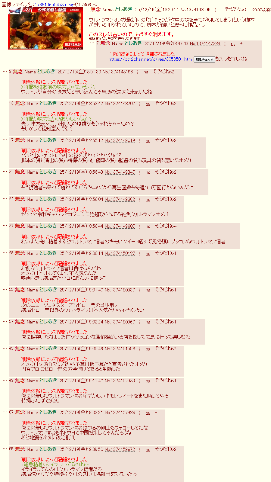 | … | 105無念Nameとしあき25/12/19(金)19:52:09No.1374163052そうだねx4>イライラしてんのはウルトラマン信者だろ |