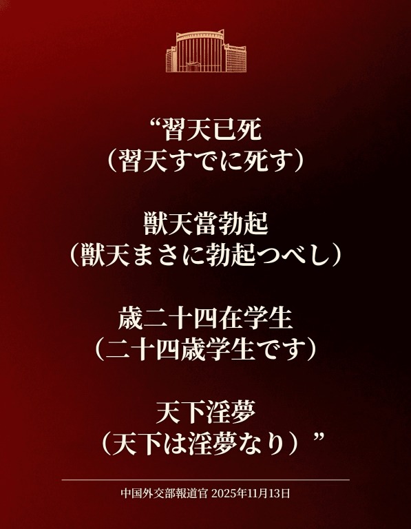 | … | 30無念Nameとしあき25/12/19(金)20:26:33No.1374172374そうだねx2>中国外交あまりにもお粗末で笑うわ |