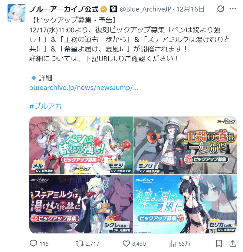 | … | 317無念Nameとしあき25/12/20(土)01:49:15No.1374249112+生放送あると言ってもブルアカ的には翌月半ばにやるであろうアニバに力入れたいから |
