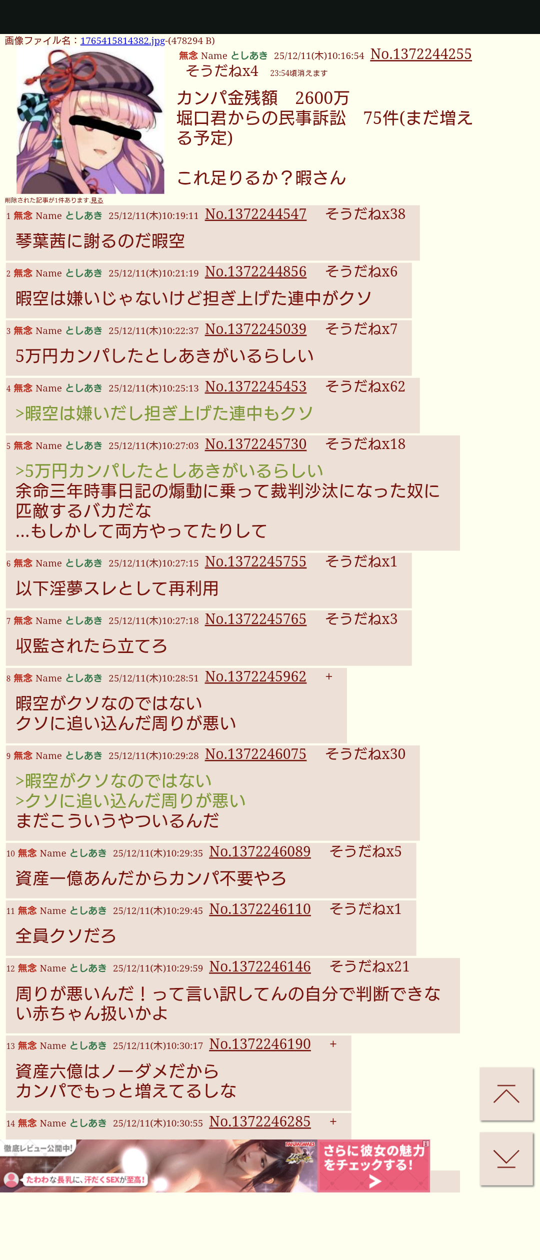 | … | 403無念Nameとしあき25/12/20(土)00:29:38No.1374237694+暇空の妄想を信じるのは荒らしてることになるの? |
