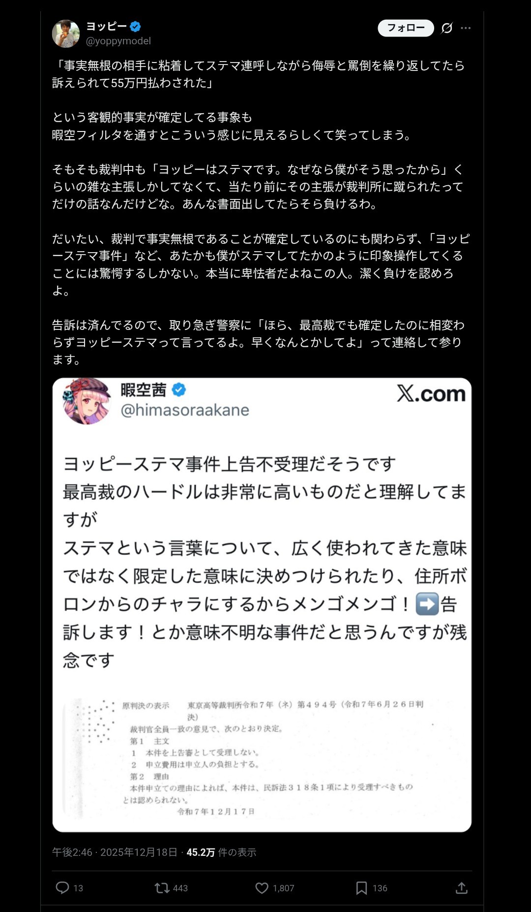 | … | 377無念Nameとしあき25/12/20(土)00:00:29No.1374231721+>>裁判所が問題ないって判断したのは無視して暇空の妄想を信じてるのね |