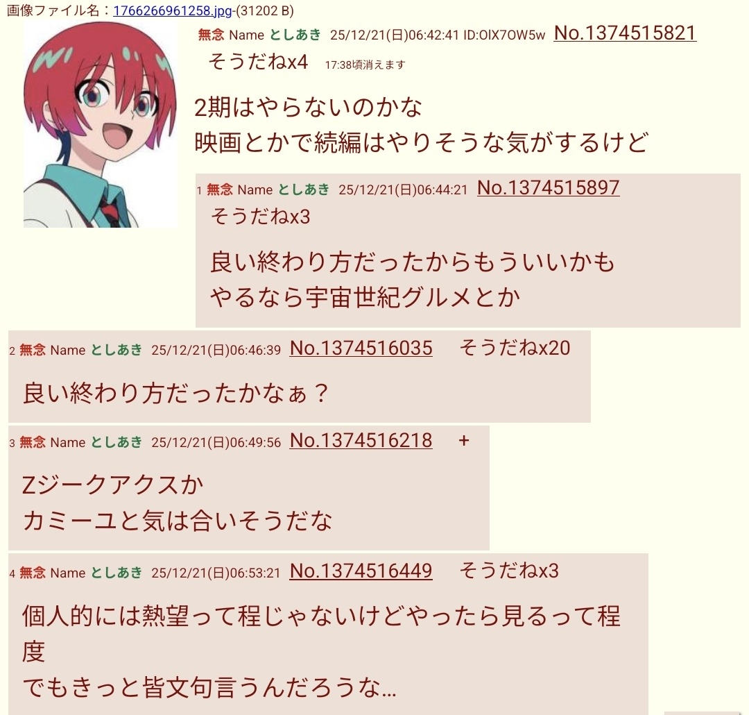 | … | 582無念Nameとしあき25/12/21(日)11:49:16No.1374562870+>2期はやらないのかな |