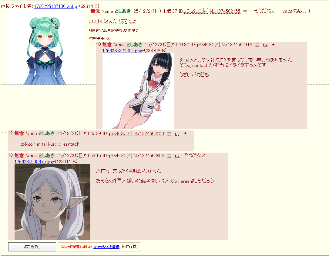 | … | 15無念Nameとしあき25/12/21(日)16:36:54No.1374628421そうだねx4もうスレの後半辺りは17人衆スレじゃなくて釣られてやってきた糖質をオモチャにするスレと化すからなぁ |