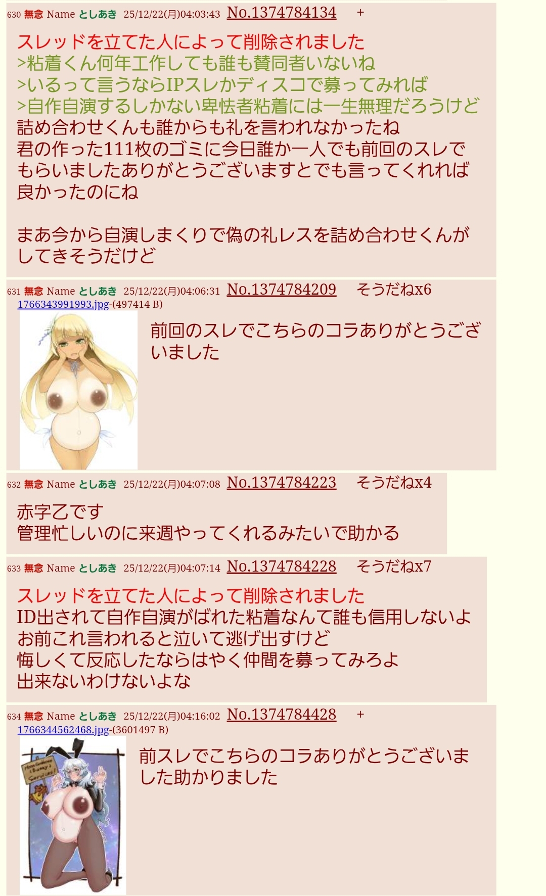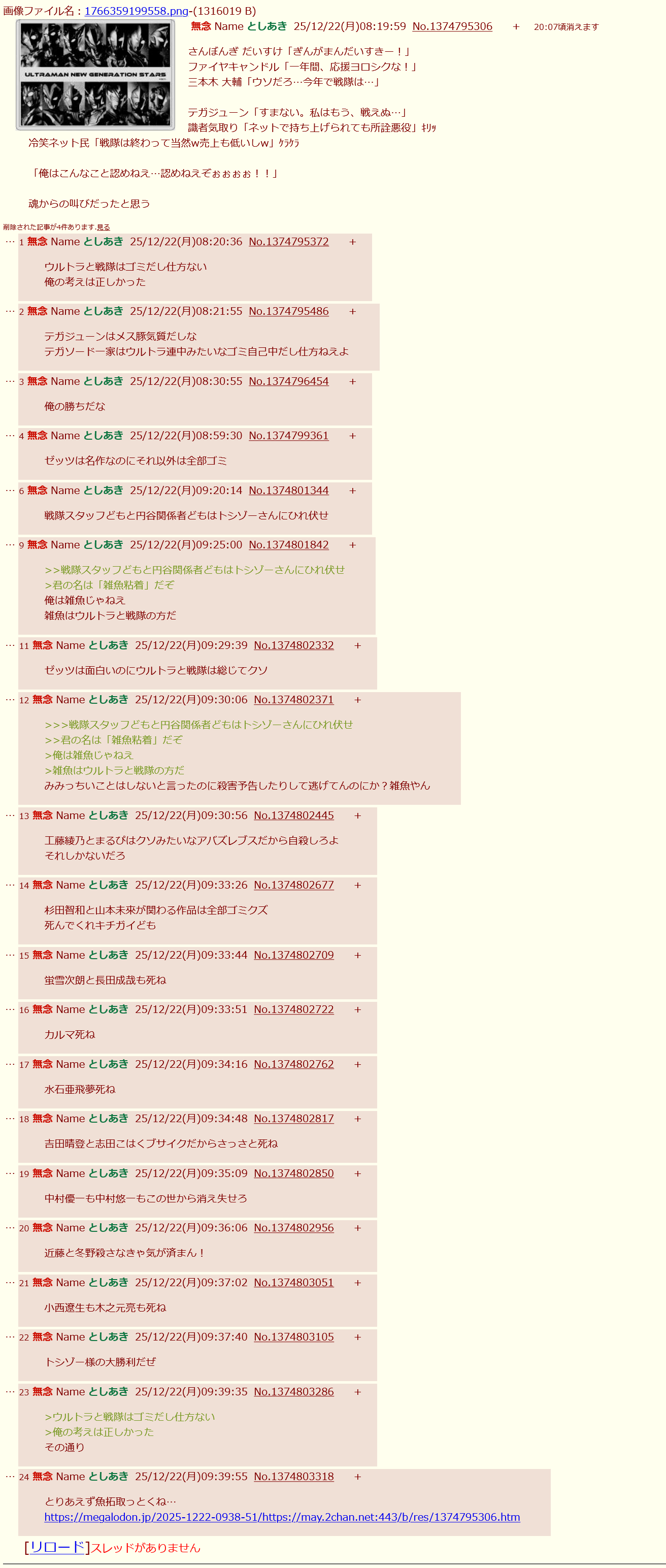 | … | 40無念Nameとしあき25/12/22(月)05:13:04 ID:e/QDEfh.No.1374785533+>色々理由つけて最後のスレも荒らすんだろうけど |