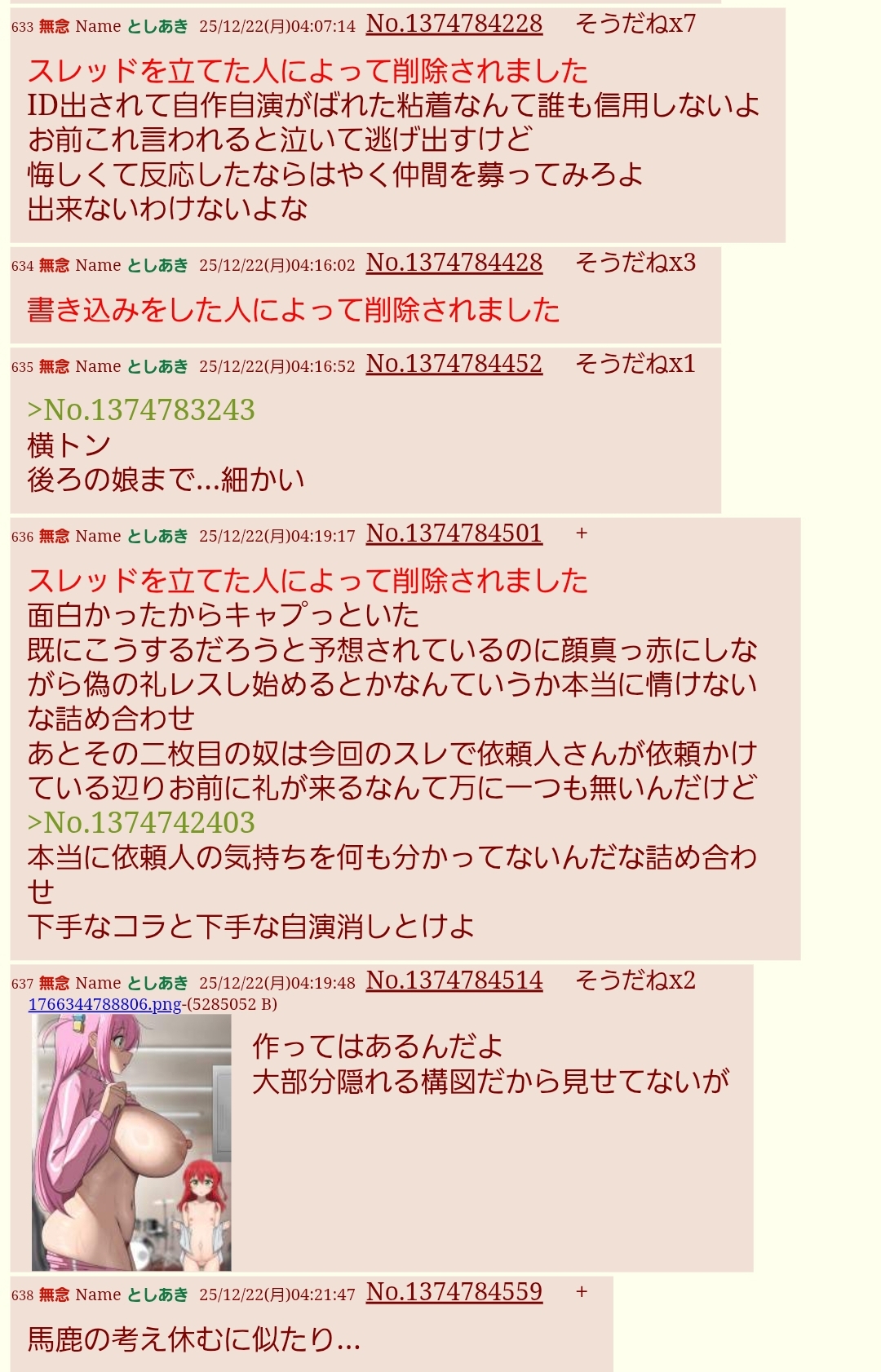 | … | 42無念Nameとしあき25/12/22(月)05:13:22No.1374785537そうだねx7>で?誰か君の詰め合わせに対して礼レスしてくれたの?情けないあの自演以外でさ言ってみてよ依頼潰しくん |