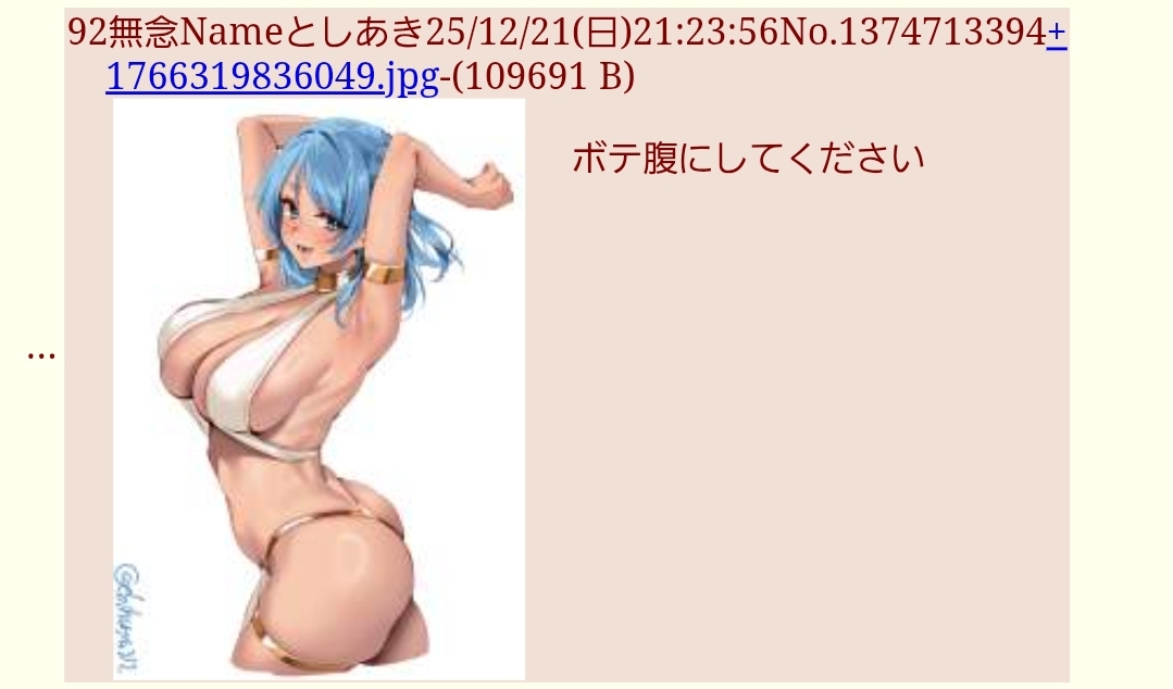 | … | 98無念Nameとしあき25/12/22(月)05:30:23 ID:e/QDEfh.No.1374785964+少なくともAI職人さんは他人の垢のついた汚い画像弄りたくないから |