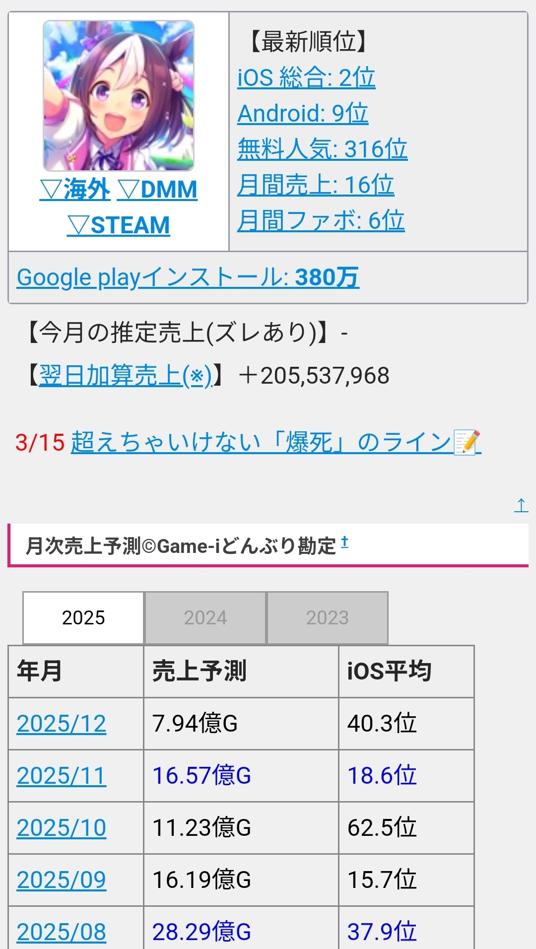 | … | 285無念Nameとしあき25/12/22(月)14:50:40No.1374848573+十分に売上でてると思うんだけどなんでウマ娘と比較する必要があるの? |