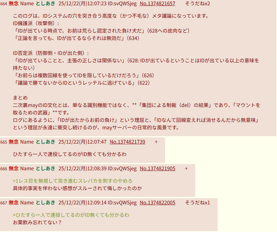 | … | 253無念Nameとしあき25/12/22(月)14:30:39 ID:ZMuhABJ6No.1374845808+>>>>>レス数を揶揄した時点で自分もそのターゲットになると想像できないところがもうね |