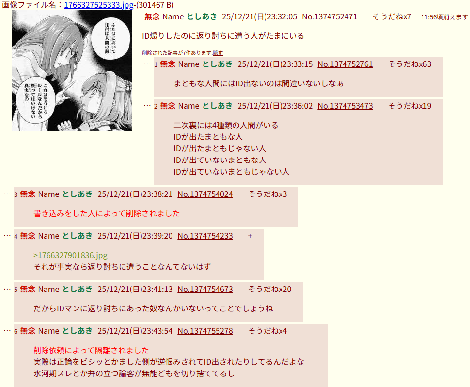 | … | 275無念Nameとしあき25/12/22(月)14:44:02 ID:WkdGIP9kNo.1374847612そうだねx2ボコボコに論破されたからIDが出たって論理的に解決したね |
