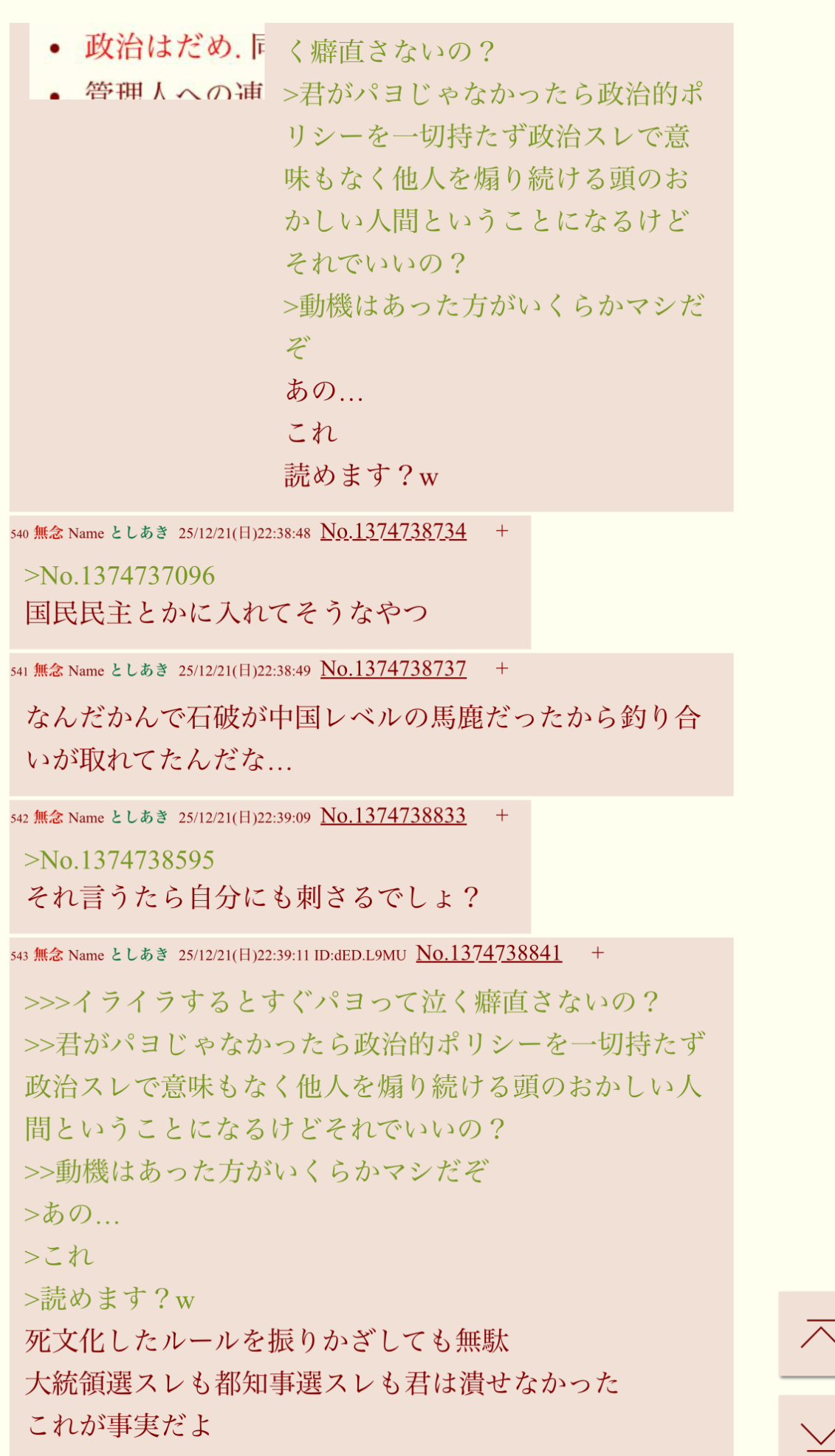 | … | 267無念Nameとしあき25/12/22(月)14:37:43 ID:N8z0HPCgNo.1374846725そうだねx2>ボコボコに論破された後にID煽り始める人って恥の概念ないの? |