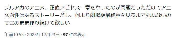 | … | 39無念Nameとしあき25/12/23(火)22:03:54No.1375145675+>アニメ適正はある(アビドス一章は除く) |