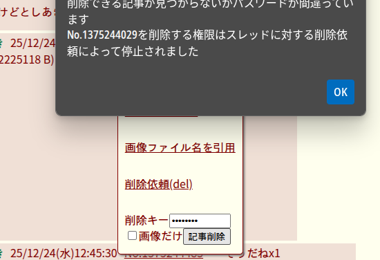 | … | 53無念Nameとしあき25/12/24(水)10:51:05 ID:0WNRjhlQNo.1375225617+レス削除できなくなった |