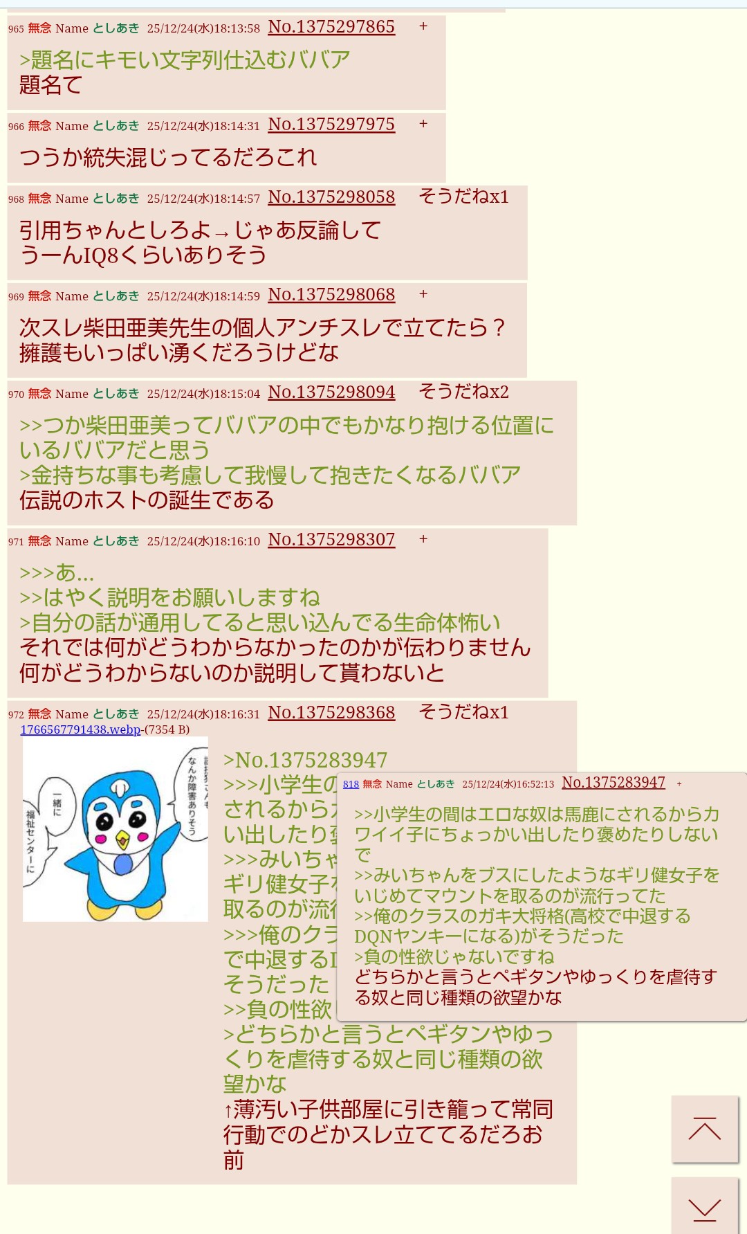 | … | 110無念Nameとしあき25/12/24(水)20:46:59No.1375336706そうだねx2>ペ虐モードが一番キモイな |