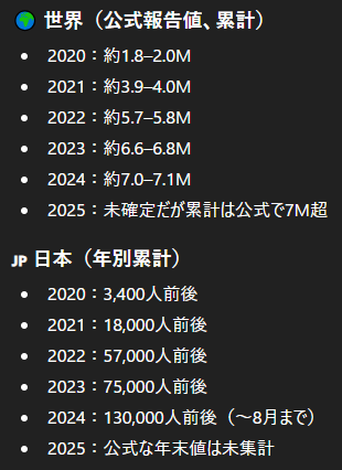 | … | 61無念Nameとしあき25/12/24(水)21:29:31No.1375351522+ 1766579371946.png-(42748 B) >日本は2020年から2024年8月までの累計で約132,000人と報道されています |