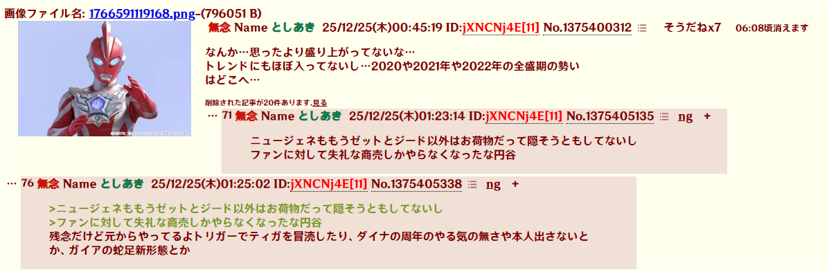 | … | 202無念Nameとしあき25/12/25(木)02:39:27No.1375411045+人気ないのを認めない特撮信者には呆れるわ |