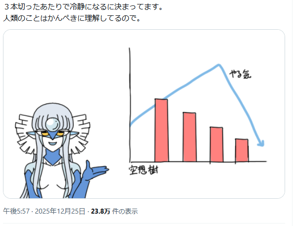 | … | 980無念Nameとしあき25/12/26(金)00:28:22 IP:126.65.*(bbtec.net)No.1375611953+>無理は言わないからこの空想樹 |