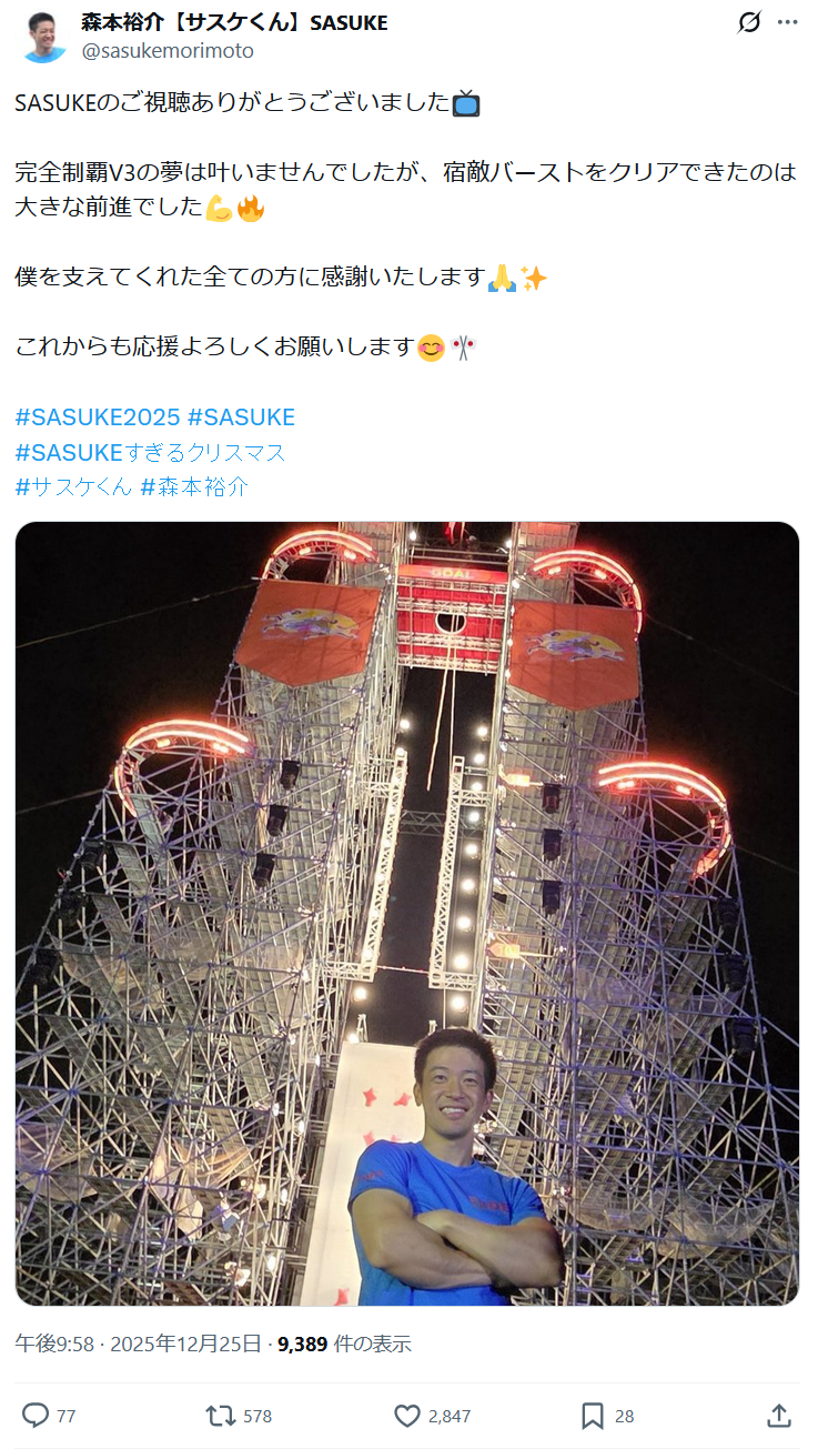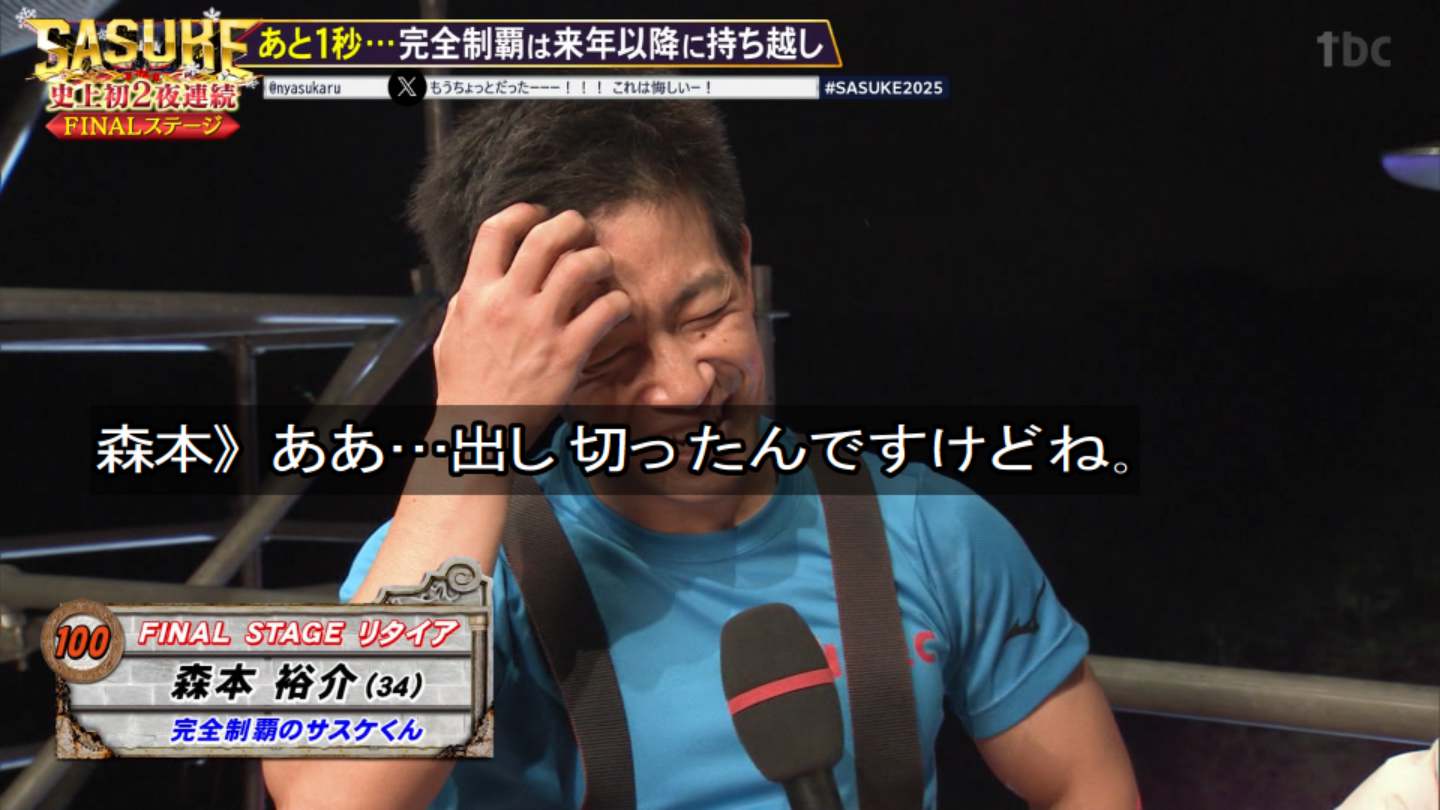 | … | 82無念Nameとしあき25/12/25(木)21:45:20No.1375571908そうだねx10※今のSASUKEがここまで人外じみた難易度になってるのはサスケ君対策のためです |