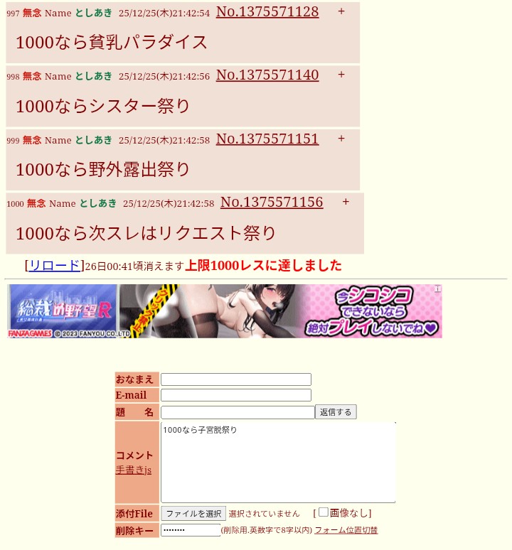 | … | 1000無念Nameとしあき25/12/26(金)00:03:06No.1375607818そうだねx121000ならぶっ掛け祭り |