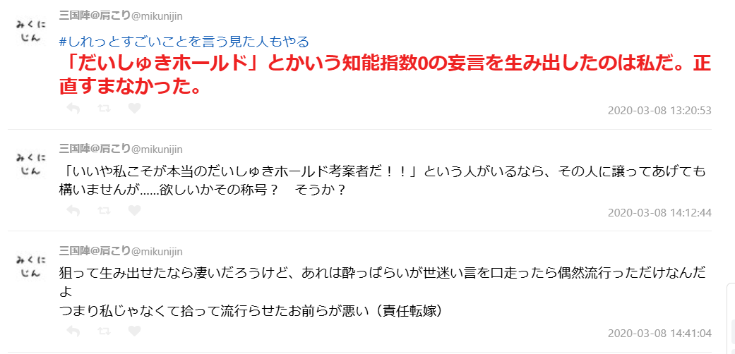 | … | 17無念Nameとしあき25/12/25(木)23:12:52No.1375596626そうだねx14だいしゅきホールドって嘘ついてまで起源を主張する言葉か? |