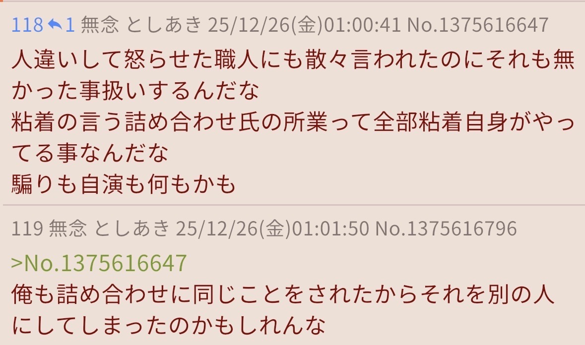 | … | 67無念Nameとしあき25/12/26(金)00:16:11 ID:8seEwwtwNo.1375610102+>ここに粘着対象の職人さんが居るって事にするとさぁ |