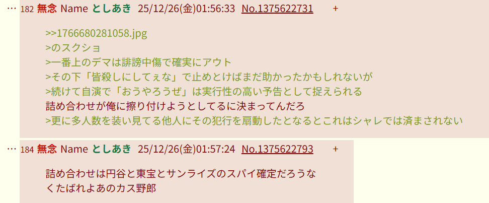 | … | 344無念Nameとしあき25/12/26(金)02:23:38No.1375624821そうだねx5スレ爆破して無かった事にした殺害予告がスクショされてたからね |
