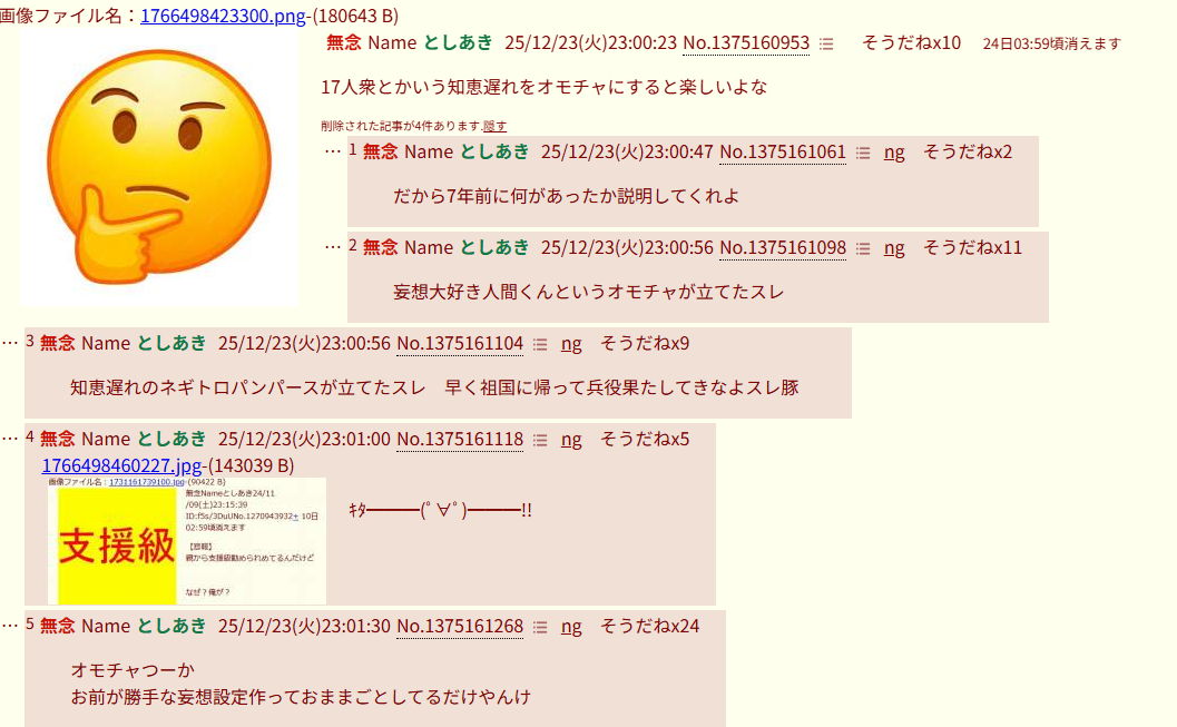 | … | 8無念Nameとしあき25/12/26(金)00:51:22No.1375615320そうだねx10知恵遅れスレ豚また泣かされて逃げて来たんか |
