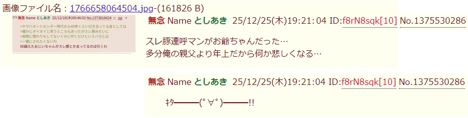 | … | 13無念Nameとしあき25/12/26(金)00:58:29No.1375616367そうだねx4汚いおっさんたちの画像保存してクソスレ立てるアホなんて一人しかおらんだろ |