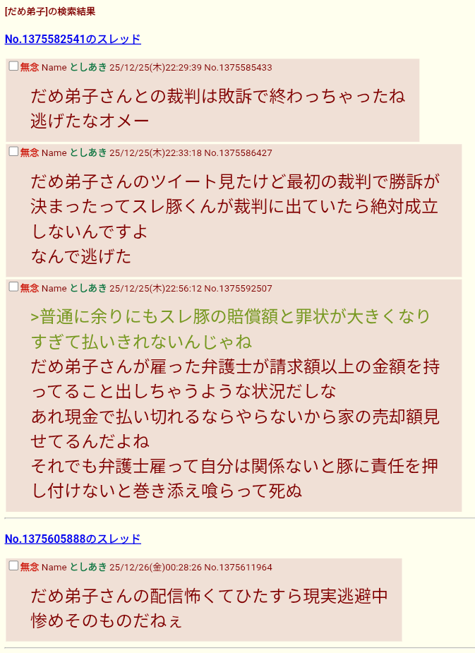 | … | 12無念Nameとしあき25/12/26(金)00:57:27No.1375616225そうだねx4>知恵遅れスレ豚また泣かされて逃げて来たんか |