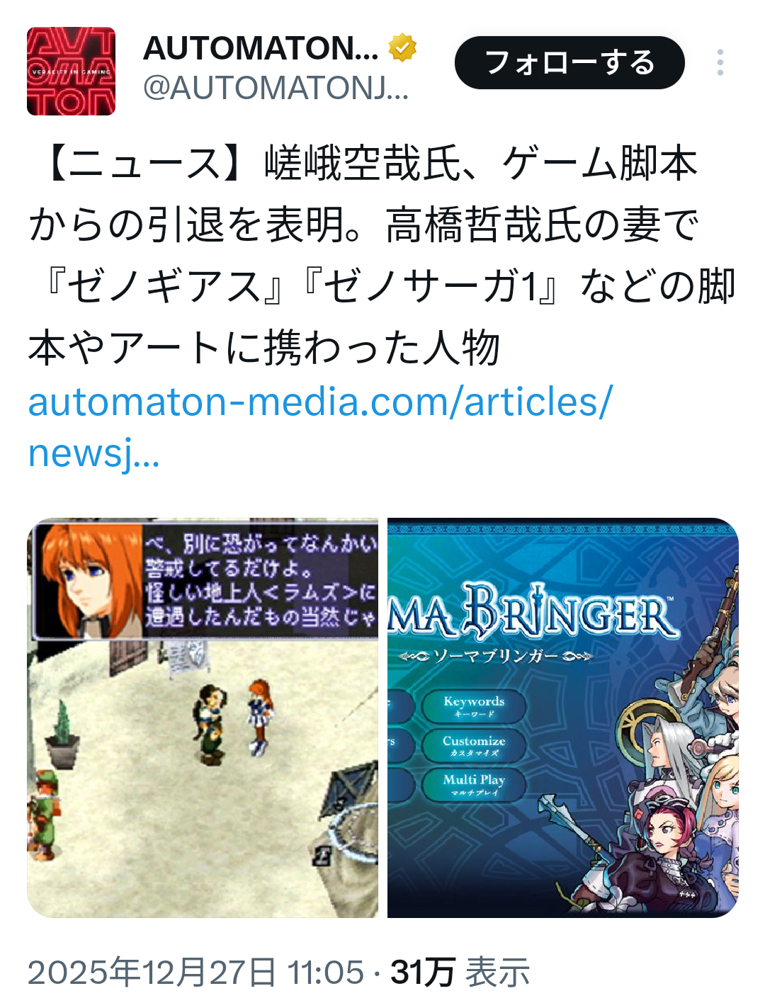| … | 45無念Nameとしあき25/12/28(日)00:49:45 ID:qQlfPppoNo.1376043022+>10年の長い旅が終わってしまった…… |