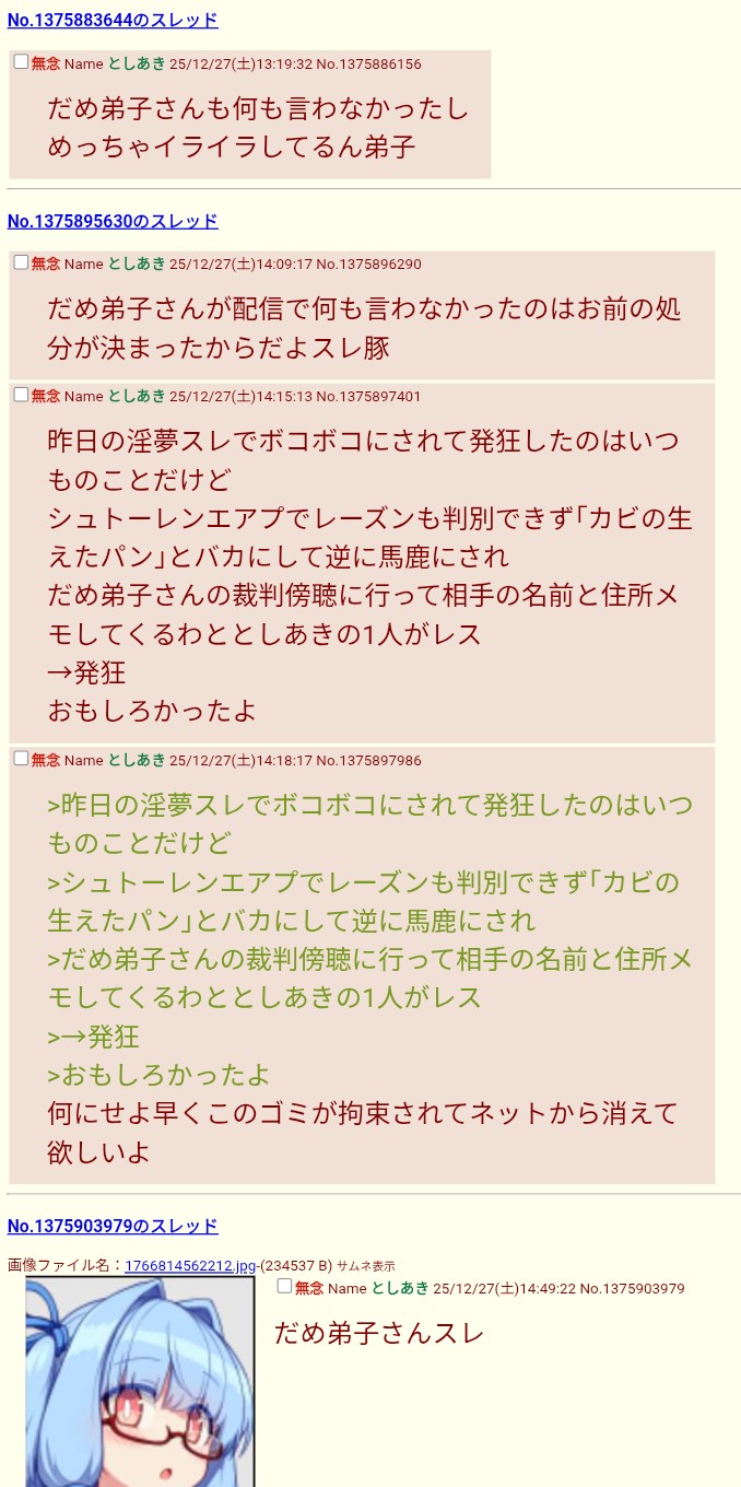 | … | 41無念Nameとしあき25/12/28(日)10:56:02No.1376097311そうだねx4今日もスレ豚一人で必死だなw |