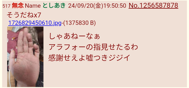 | … | 229無念Nameとしあき25/12/28(日)11:58:27No.1376108958+尊師は親指の爪が四角じゃなくて三日月型だから爪さえ写ってればわかる |