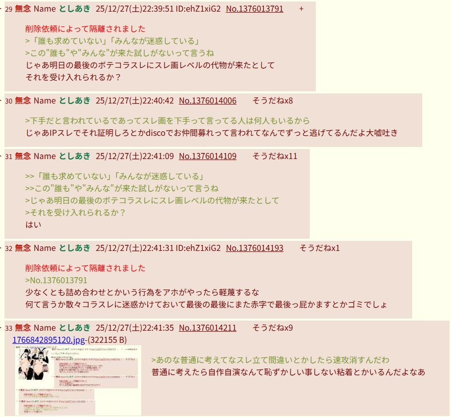 | … | 100無念Nameとしあき25/12/28(日)14:08:30No.1376136171そうだねx1IDが出て皆から嫌われている&自演してた証明をし |