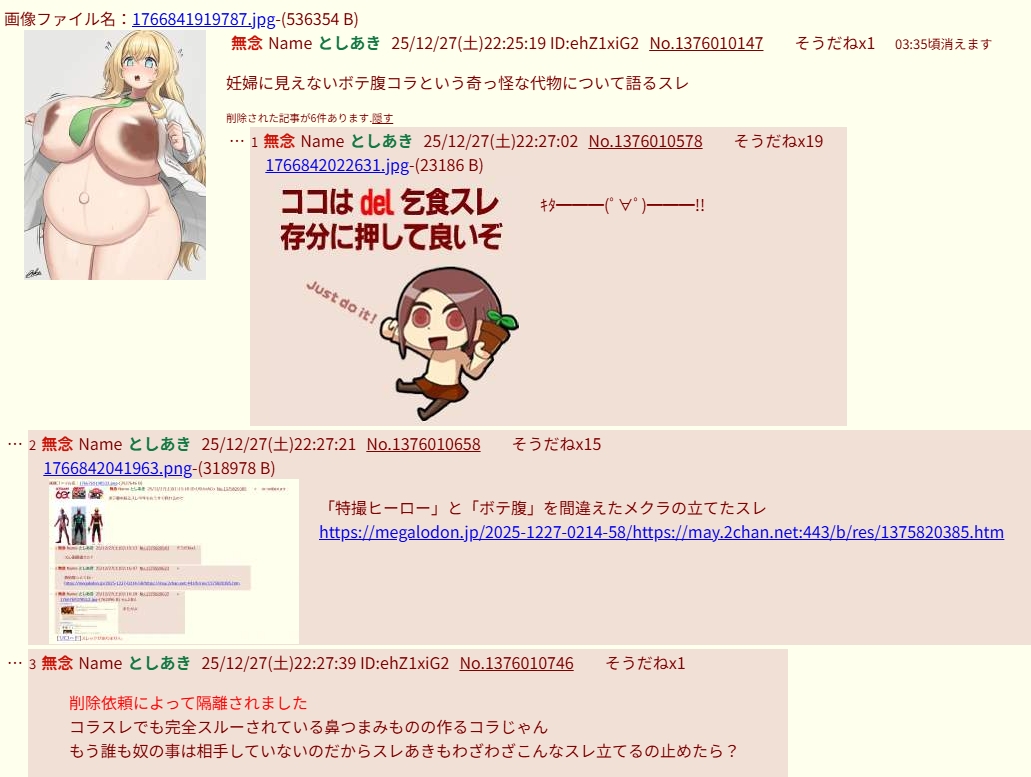 | … | 61無念Nameとしあき25/12/28(日)13:44:06No.1376131361+妊婦に見えると何度言ってもそのレスが見えてないよね雑魚粘着くん |