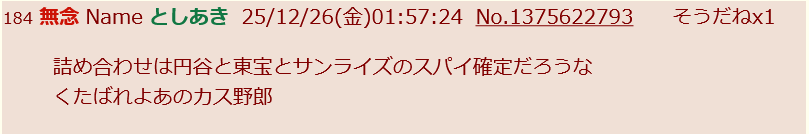 | … | 34無念Nameとしあき25/12/28(日)13:29:58No.1376128340そうだねx1>はいもう反論できなくて黙ってるスレ豚 |