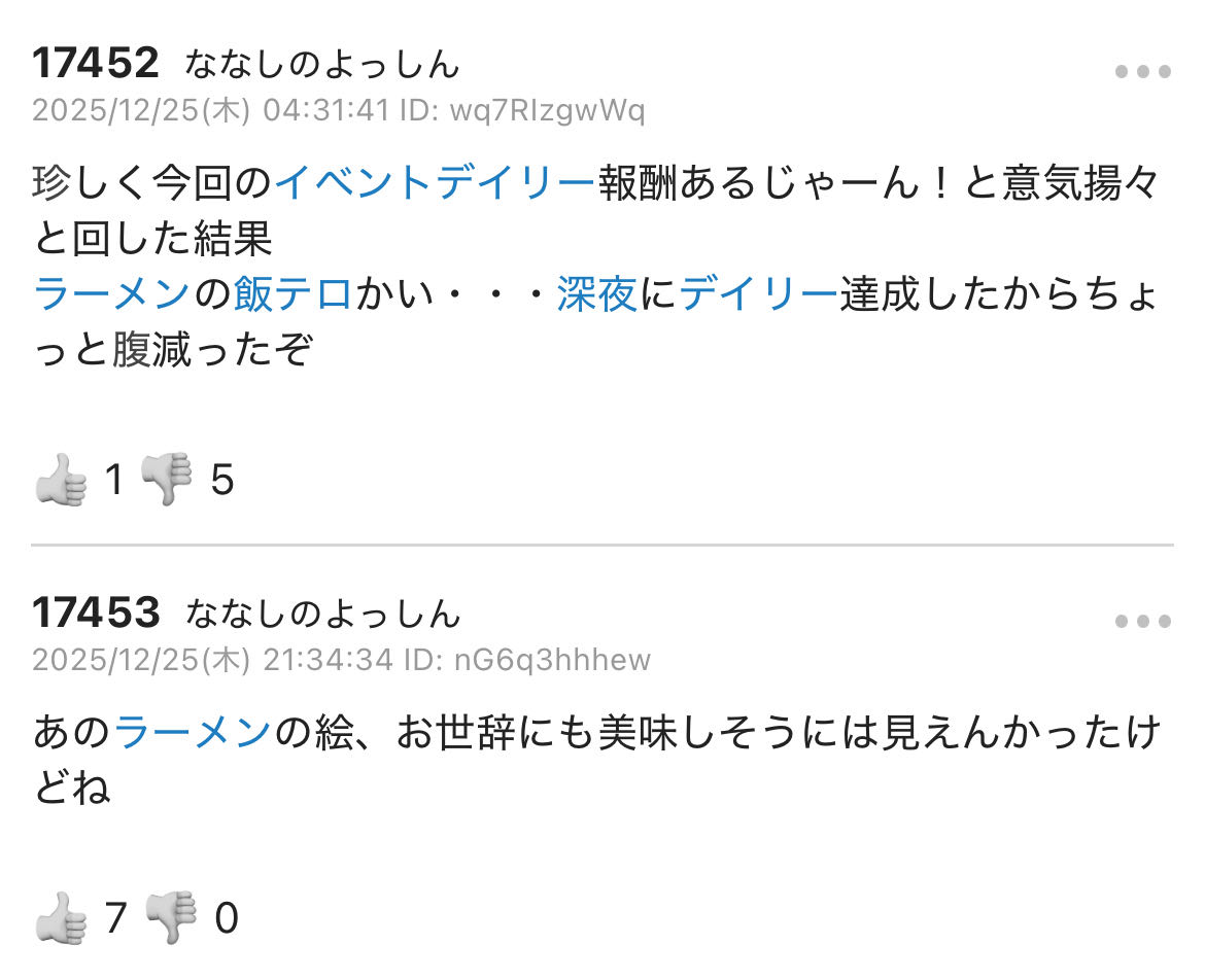 | … | 133無念Nameとしあき25/12/28(日)19:00:35No.1376205573そうだねx4>やっぱり他所でお仲間呼んで壁打ちしてたわね |