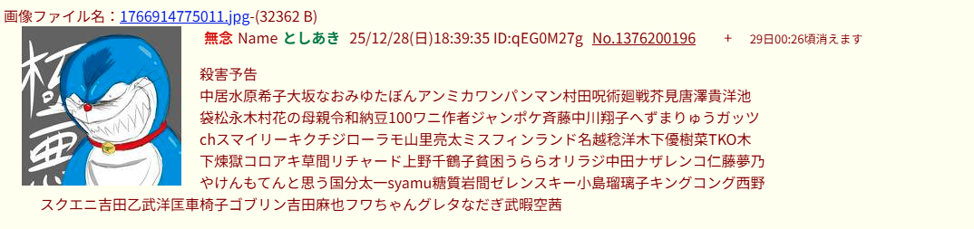 | … | 70無念Nameとしあき25/12/28(日)19:32:04 ID:t0EHz1wcNo.1376214239+>>殺害予告 |