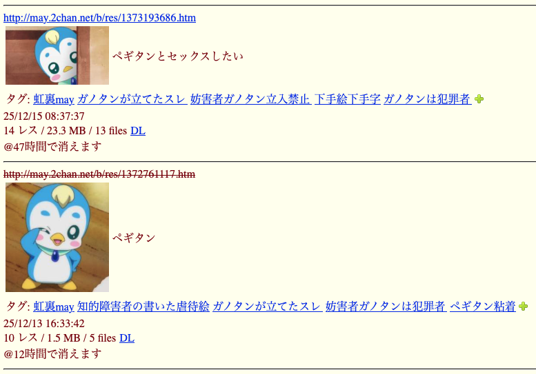 | … | 83無念Nameとしあき25/12/28(日)20:35:15No.1376233568そうだねx2>ペギスレ荒らしてるのはペ虐爺さんみんな知ってる |