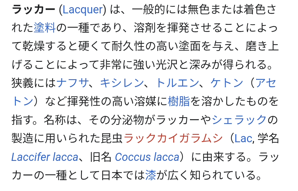 | … | 92無念Nameとしあき25/12/29(月)00:36:04No.1376293045そうだねx1 1766936164861.png-(189227 B) ラッカーの綴り調べたらLacquerで語源的にはLaccaなんすね |