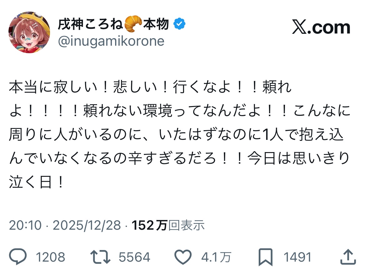 | … | 40無念Nameとしあき25/12/29(月)12:00:43No.1376356343そうだねx1かなたそはなんとか隠そうとしてたのに普通の配信中に勝手に涙が出るほど追い詰められてたからね |