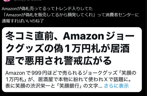 | … | 8無念Nameとしあき25/12/29(月)14:51:06No.1376390894+>>アマゾンで偽札売ってるコミケの人は注意 |