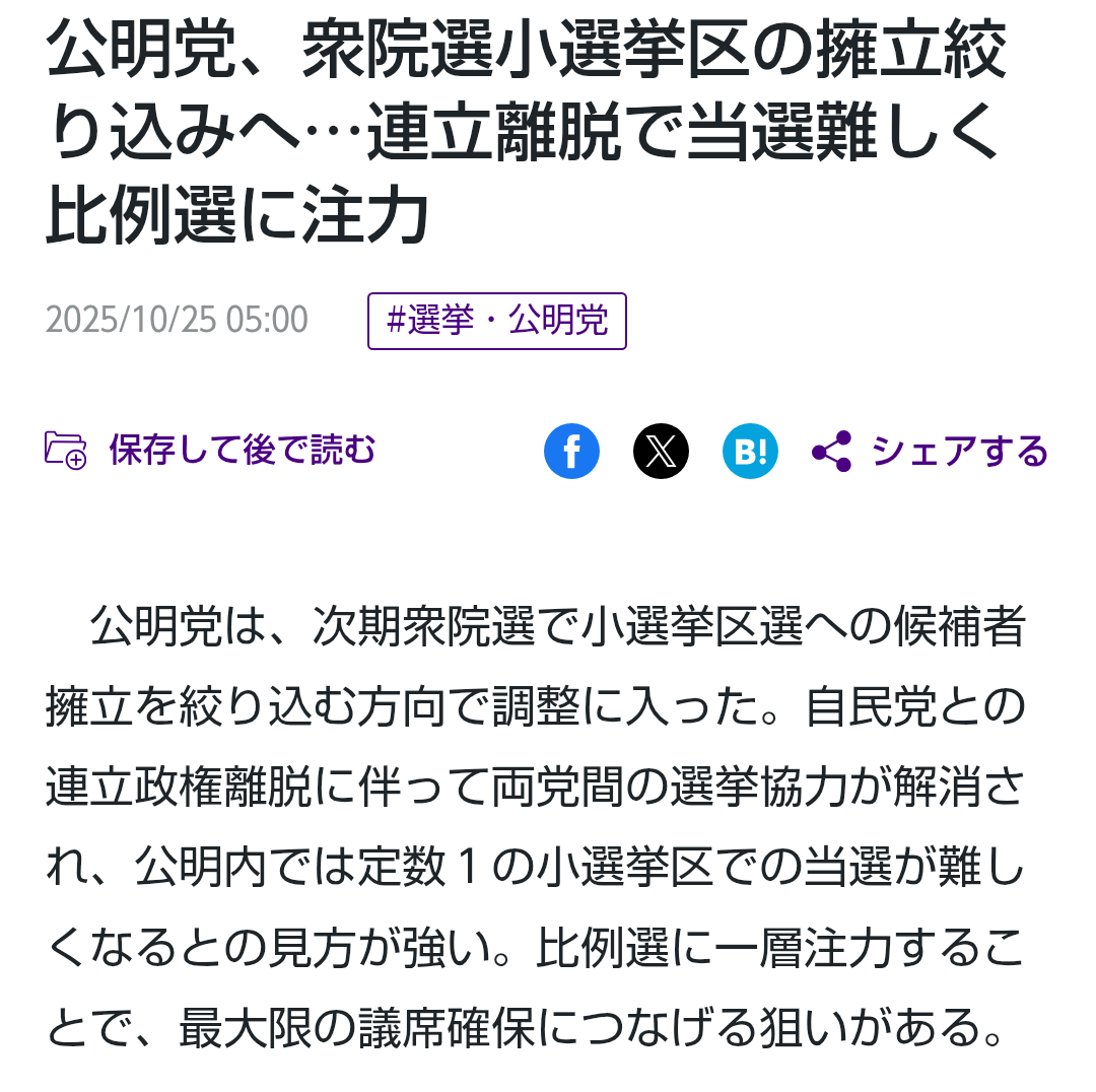 | … | 38無念Nameとしあき25/12/29(月)16:47:11No.1376414780+公明党は小選挙区には候補を出さない方針だってことすら調べてない奴が議席数がどうのこういう言うの笑っちゃうんだけど |