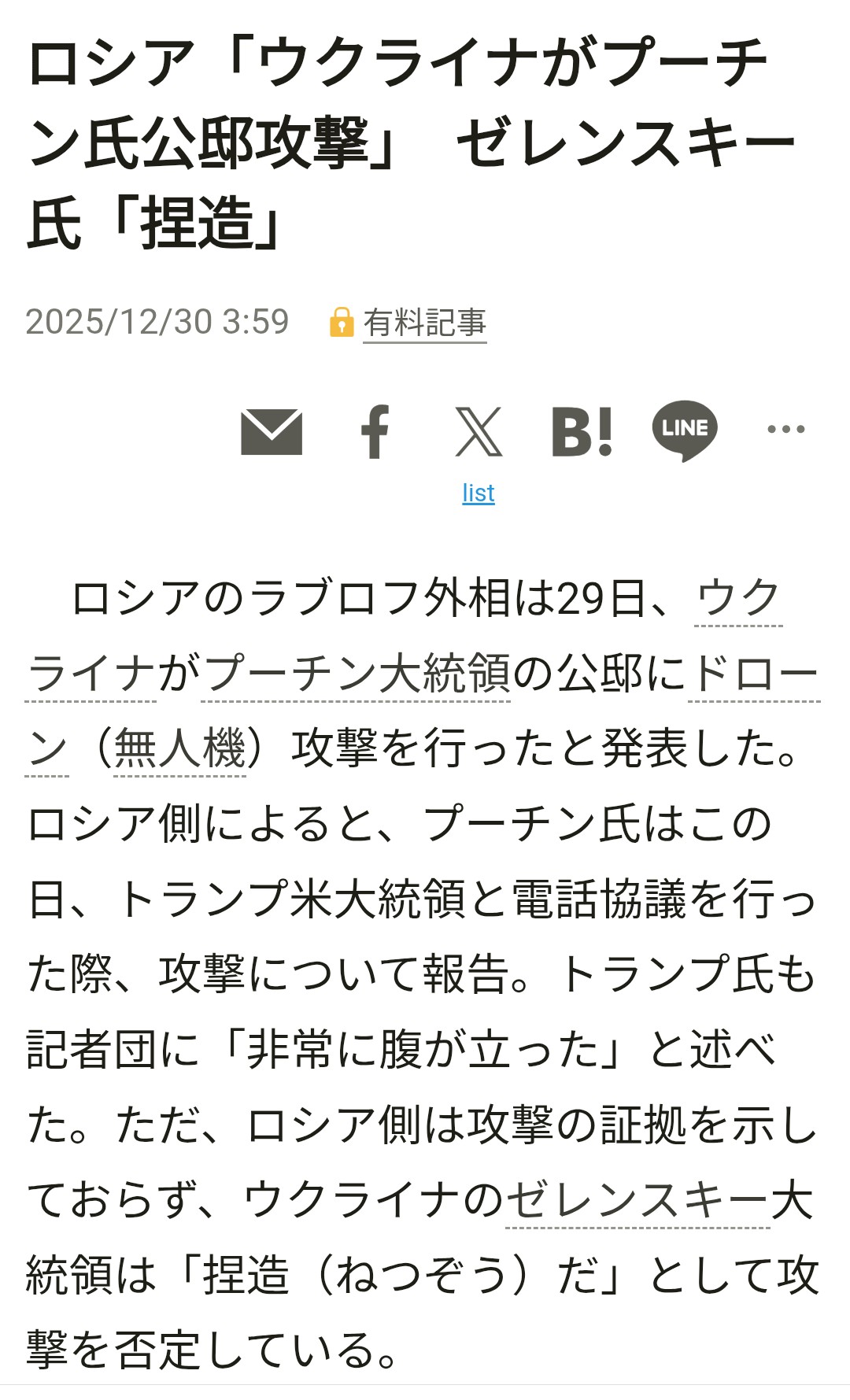 | … | 65無念Nameとしあき25/12/30(火)07:50:48No.1376557172+昨晩プーチンの公邸にドローン攻撃して失敗してプーチンは当然トランプも交渉中にやるかと激怒したみたいだからゼレンスキーへのボルテージ1段階上がるの決定だな |